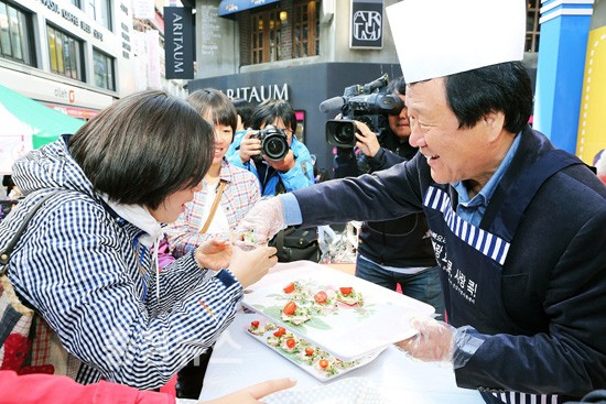 염홍철 시장은 26일 으능정이거리에서 펼쳐진 ‘아빠요리대회’에서 음식을 요리하여 시민들에게 시식을 권하고 있다. 이날 행사는 자녀와 한 팀으로 진행되었는데 100팀에 200여명이 참가해 성황을 이뤘다.