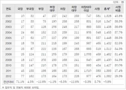 특히 국장은 2001년 10명에서 무려 7배 이상 증가했고, 부국장은 32명에서 5배 이상 증가했다. 부장도 47명에서 173명으로 3배 이상 증가했고, 부장대우는 157명에서 164명으로 7명 증가했다. 반면 하위직급에 해당하는 차장은 242명에서 173명으로 69명 감소했으며, 차장대우는 259명에서 228명으로 31명 감소했다. 즉 고위직급으로 갈수록 해마다 증가하고, 하위직급은 해마다 감소하는 기형적 현상이 해마다 심화되고 있는 것이다.
