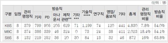 방송통신위원회가 발간한 <2012 방송산업실태조사보고서>에 의하면, MBC는 전체 방송사 종사자 2023명 가운데 관리행정직이 374명으로 18.4%를 차지했다. 반면 KBS는 4830명 가운데 7.8%인 379명으로 MBC의 절반 이하였으며, SBS는 872명 가운데 16%인 132명으로 MBC보다 낮았다.