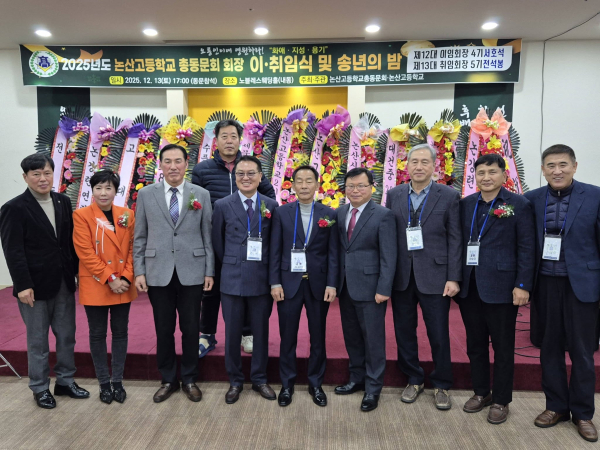 김국회 교장(지난 9월 취임)은 총동문회장 이·취임을 축하하며 논산고가 동문 9,000명에 달하는 '놀뫼교육 1번지'로 자리 잡았음을 강조했다. 또한 김 교장은 올해 학교공간 재구조화 사업을 통해 낡은 학교 시설이 최신식으로 정비되었으며, '지성과 용기로 함께 성장하는 글로컬 리더 육성'이라는 새 비전을 세웠다고 밝혔다.