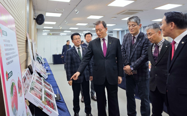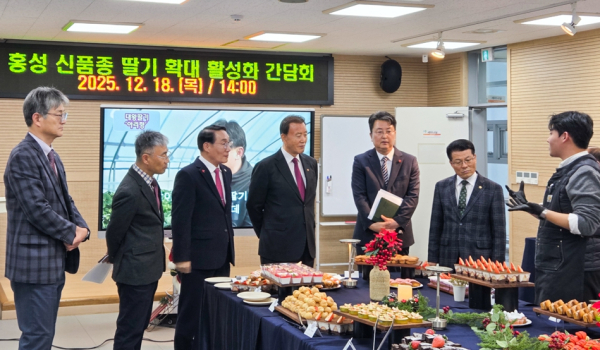 [충청뉴스 최형순 기자] 한국농수산식품유통공사(aT) 홍문표 사장은 18일, 충청남도 홍성군 농업기술센터에서 개최된 ‘홍성군 프리미엄 신품종 딸기 품평회’에 참석하여 지역 농업인들과 함께 신품종 딸기의 수출 확대 방안을 심도 있게 논의했다.