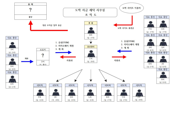 조사 결과, 이들은 올해 7월부터 8월까지 약 45일간 오피스텔 합숙소에서 주·야간 3교대(8시간)로 24시간 근무하며 조직적으로 범행을 저질렀다. 이 기간 동안 대포통장으로 입금된 도박자금 규모만 약 100억원 규모이며, 이들은 자금을 유령 법인 계좌 등으로 이체해 세탁해 주는 대가로 약 1억 1천만원을 챙긴 혐의이다.