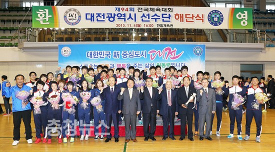 대전시는 제94회 전국체전(10.18 ~ 10. 24, 인천광역시) 대전선수단 해단식을 4일 오후 한밭체육관에서 염홍철 시장을 비롯한 선수 및 지도자 등 300여명이 참석한 가운데 개최했다.