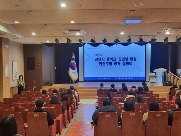 한편, 천안교육지원청은 중학교 신입생 입학등록은 12월 30일부터 2026년 1월 6일까지 배정관리시스템을 통해 비대면 온라인으로 방식으로 진행되며, 타시도 전입자 등을 대상으로 한 재배정 접수는 2026년 1월 29일부터 2월 3일까지 실시될 예정이다.