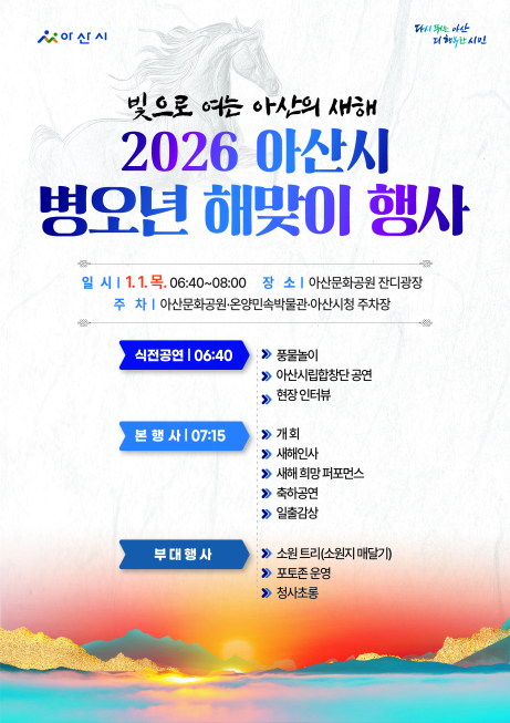 [충청뉴스 유규상 기자] 아산시는 2026년 병오년(丙午年) 새해를 맞는 첫행사로 오는 1월 1일 오전 6시 40분부터 8시까지 아산문화공원 잔디광장에서 ‘2026 병오년 해맞이’를 개최한다.