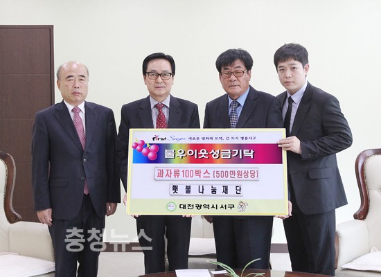 대전광역시 서구(구청장 박환용)는 5일 구청 다목적실에서 횃불나눔재단(이사장 전병권)으로부터 관내 저소득층 아동을 위한 과자류 100Box(500만원 상당)를 전달 받았다.