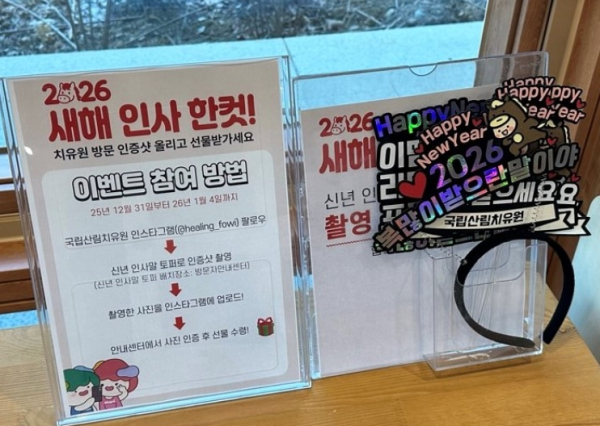 [충청뉴스 최형순 기자] 산림청 한국산림복지진흥원(원장 남태헌) 국립산림치유원은 2026년 새해를 맞아 치유원을 찾는 방문객들을 대상으로 ‘새해 인사 한 컷!’ 인증샷 이벤트를 운영한다고 31일 밝혔다.