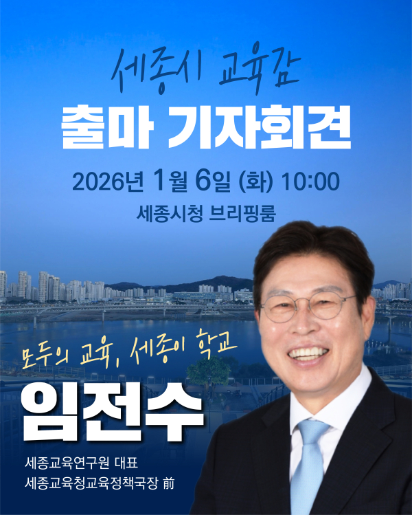 [충청뉴스 최형순 기자] 세종특별자치시 교육 현장의 전문가이자 교육행정가로 활동해 온 임전수 세종교육연구원장이 오는 1월 6일(월) 오전 10시, 세종시청 브리핑룸에서 기자회견을 열고 세종특별자치시교육감 선거 출마를 공식 선언한다.