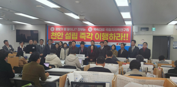 [충청뉴스 유규상 기자] 홍성현 충남도의회의장(이하 홍 의장)은 6일 국민의힘 충청남도 천안시 도의원·시의원, 갑·을·병 당협위원장, 천안시장 출마 예정자 일동이 참여한 가운데 천안시청 브리핑실에서 기자회견을 갖고 220만 도민의 염원인 ‘국립치의학연구원 천안 설립’(이하 연구원 설립)을 두고, 최근 정부 일각에서 감지되는 공모 전환 움직임에 대해 깊은 우려를 표하며, 연구원의 천안 설립 즉시 이행"을 촉구했다.