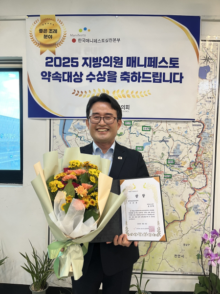 [충청뉴스 유규상 기자] 안장헌 충남도의원(아산5·더불어민주당)이 2025 매니페스토 약속대상 좋은조례분야 우수상을 수상하며, 의정활동 ‘6관왕’을 달성했다.