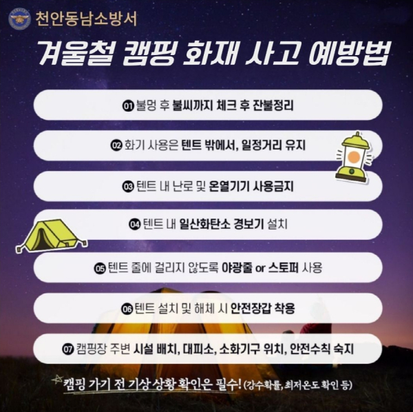 [충청뉴스 유규상 기자] 천안동남소방서(서장 강종범)는 겨울철 캠핑 시 화재 등 각종 안전사고 예방을 위한 각별한 주의를 당부했다.