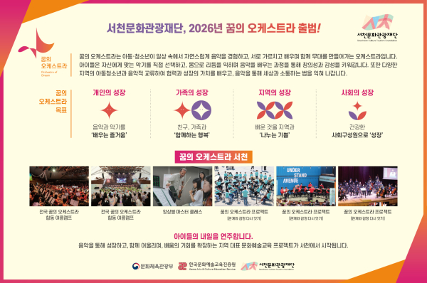 [충청뉴스 서천 = 조홍기 기자] 서천문화관광재단이 문화체육관광부와 한국문화예술교육진흥원이 주관하는 「2026 꿈의 오케스트라」 신규 거점기관으로 최종 선정됐다.