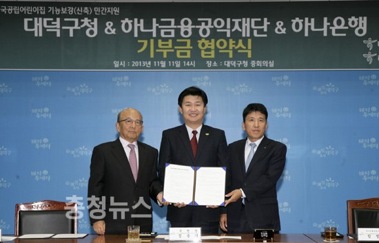 대덕구(구청장 정용기)는 11일 하나금융공익재단(이사장 윤교중)과 하나은행 충청사업본부(대표 함영주)가 함께한 자리에서 국공립어린이집 신축에 2억원을 지정기탁하는 협약식을 가졌다.
