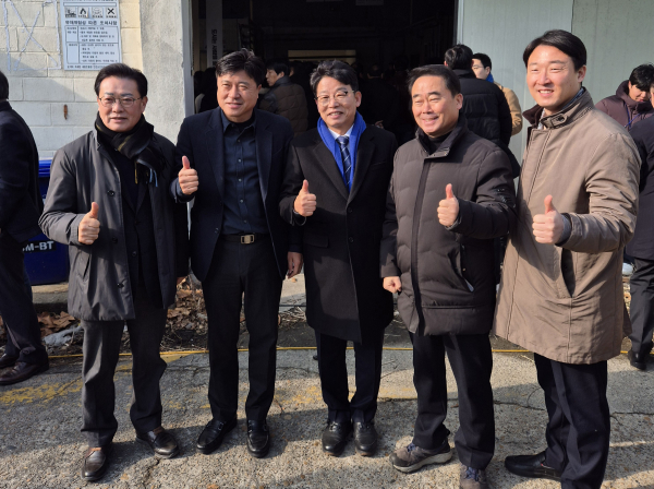 김찬술 전 대전시의원의 대덕구청장 출마 회견장을 찾은 제8대 대전시의원들. (왼쪽부터) 남진근·김종천·김찬술·조성칠·박수빈 전 시의원