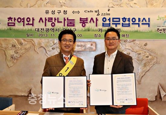 대전시 유성구(구청장 허태정)와 카페 찜(대표이사 신상호)은 13일 지족동 카페 찜 사업장에서 ‘참여와 사랑 나눔 후원을 위한 업무협약’을 체결했다.