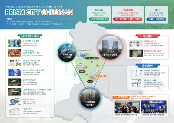 시는 올해 연말까지 ‘천안시 거점형 스마트도시 조성사업’을 추진하고 M-AX 클러스터·강소형 데이터센터 등 국책사업에 선제 대응하며, 융복합 스마트 기술로 기업 지원과 공간 구조를 결합한 ‘거점형 스마트도시’를 조성하고, 국토교통부의 ‘스마트도시 인증’을 획득할 계획이다.