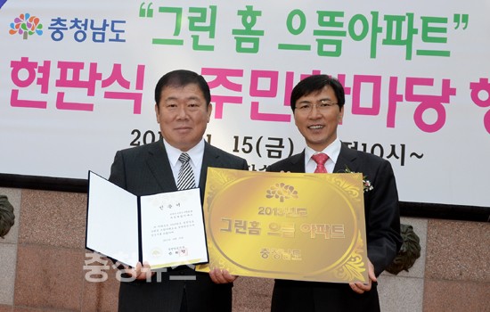 충남도는 15일 천안 불당 대동다숲아파트와 아산 풍기 동일하이빌아파트에서 입주자회 주관으로 그린홈 으뜸아파트 현판식을 잇따라 개최했다.
