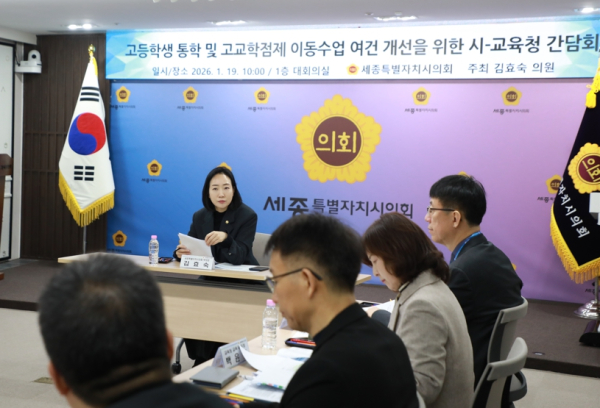 세종시의회 김효숙 부의장(나성동, 산업건설위원회)은 지난 19일 의회 대회의실에서 세종시청 교통국 및 세종시교육청 교육국·행정국 관계 공무원들이 참석한 가운데 ‘고등학생 통학 및 고교학점제 이동수업 여건 개선을 위한 시·교육청 협업 간담회’를 개최했다.