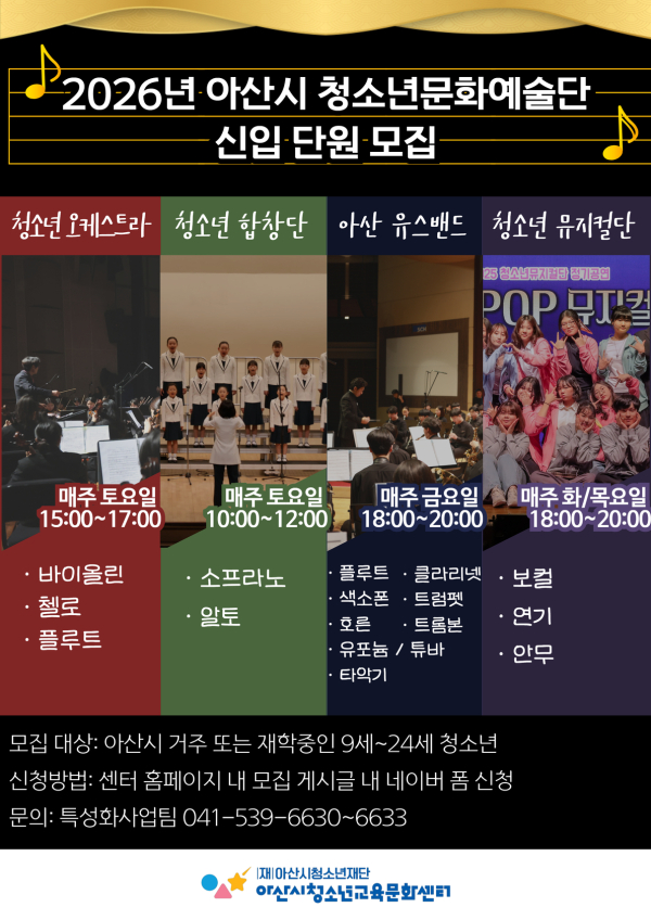관악 중심의 아산 유스밴드, 합창을 통한 화합과 표현의 청소년합창단, 현악기와 목관악기를 기반으로 한 청소년오케스트라, 연기·노래·안무가 결합된 종합예술 형태의 청소년뮤지컬단은 각기 다른 예술 영역에서 청소년의 재능과 잠재력을 확장할 예정이다.