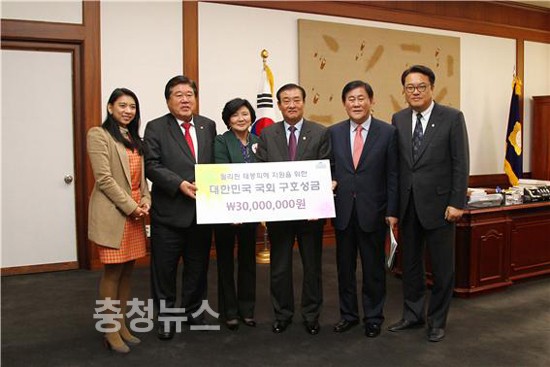 강 의장은 성금을 전달하며 “여야의 국회의원들이 힘을 모아 만든 성금이 필리핀 국민들에게 조금이나마 도움이 되길 바란다”면서 “앞으로 대한적십자사가 필리핀 피해복구를 위해 더 많은 역할과 활동을 해 줄 것”을 당부했다.