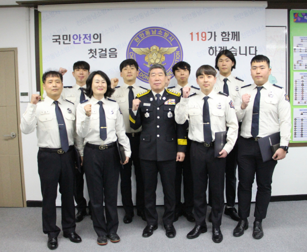 강종범 천안동남소방서장은“각자의 자리에서 책임과 사명감을 가지고 성실히 근무해 온 결과가 오늘의 승진으로 이어졌다”며“앞으로도 시민의 생명과 재산을 지키는데 있어 더욱 신뢰받는 소방공무원이 되어주길 바란다”고 말했다.