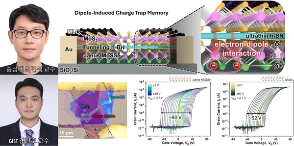 [충청뉴스 이성현 기자] 충남대학교는 신소재공학과 최민섭 교수 연구팀이 광주과학기술원(GIST) 연구팀과 2차원 야누스(Janus) 전이금속칼코겐화합물(TMD)의 고유한 내부 분극을 활용해 기존 대칭형 TMD 소재보다 우수한 전기적 특성을 갖는 초박막 비휘발성 메모리 소자를 개발했다고 11일 밝혔다.