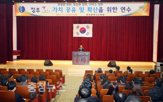 대전시교육청(교육감 김신호)은 박근혜정부 핵심 국정과제인 정부3.0에 대한 인식을 높이기 위해 본청, 지역교육지원청, 직속기관 직원을 대상으로 27일 오후 시교육청 대강당에서 특별 교육을 실시했다.