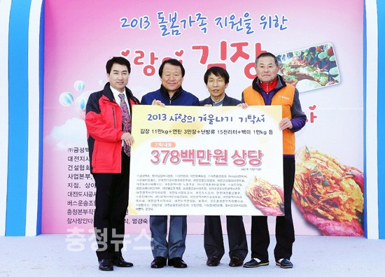 특히 복지만두레 사랑의 겨울나기 캠페인에 참여한 정성욱 ㈜금성백조 회장, 송우영 대전청과(주) 회장, 송성철 중앙청과 회장 등 행사 후원자들과 국제라이온스협회 356-B지구 강도묵 총재 등 회원 230명, 한국전력 대전충남지역본부 박권식 본부장 등 30명, 대전시청 공무원노동조합 여황현 위원장 등 45명이 참여하는 등 김장나눔 행사에 나눔의 열기로 한층 추워진 날씨를 봉사자들과 함께 녹였다.
