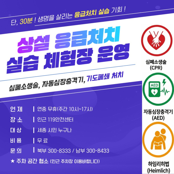 [충청뉴스 최형순 기자] 세종특별자치시 소방본부가 시민들의 응급대처 역량을 강화하고 더욱 촘촘한 사회 안전망을 구축하기 위해 오는 23일부터 관내 모든 119안전센터에서 상설 응급처치 실습 체험장을 운영한다.
