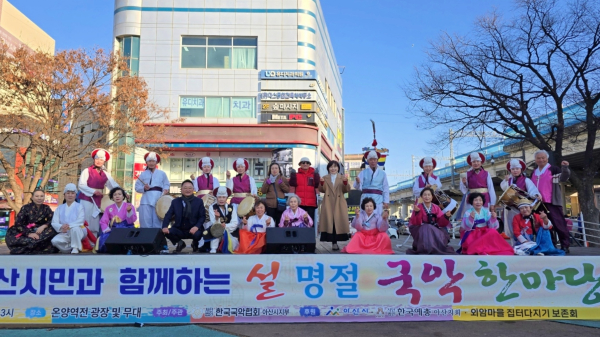 [충청뉴스 유규상 기자] 2026년 병오년(丙午年) 설날을 맞아 사단법인 한국국악협회 아산시지부(지부장 이상례)는 지난 18일, 설 연휴를 맞아 온양온천역 광장에서 ‘2026 아산시민과 함께하는 설 명절 국악 한마당’ 공연을 개최했다.