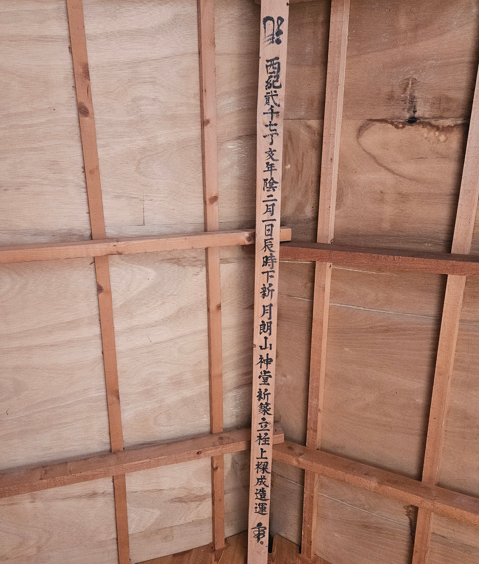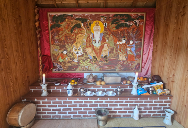 산신각 내부에는 산신령과 호랑이가 함께하는 산신도를 만날수 있고 머리 위의 상량보에는 산신각이 2007년도 정해년에 건립되었다고 하는 기록을 확인할 수 있다.