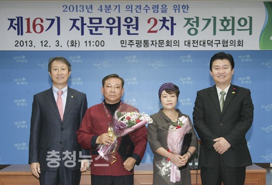 민주평화통일자문회의 대덕구협의회(회장 강덕구)는 3일 구청 중회의실에서 통일의견수렴 및 제2차 정기회의를 개최했다. ▲ 좌로부터 강덕구 민주평통대덕구협의회장, 김두수 수상자, 권종숙 수상자, 정용기 대덕구청장 이날 회의는 강덕구 협의회장을 비롯한 정용기 대덕구청장, 민주평통 자문위원 등 40여명이 참석한 가운데 유공자시상 및 통일의견수렴 주제 토론, 2014년 사업계획보고 순으로 진행됐다. 저작권자 © 충청뉴스 무단전재 및 재배포 금지 최온유 기자 다른기사 보기 기사가 마음에 드셨나요? 충청뉴스 좋은 기사 후원하기 1,000원 3,000원 5,000원 10,000원 30,000원 50,000원 직접입력 비회원 약관동의하기 ※ 소중한 후원금은 더 좋은 기사를 만드는데 쓰겠습니다.