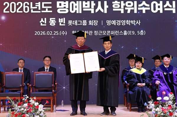 이광형 총장은 “신동빈 회장은 과학기술과 산업, 사회적 가치를 연결하는 책임 있는 경영을 통해 기업의 새로운 역할을 제시해 온 인물”이라며 “KAIST와의 산학협력을 통해 연구 인프라 확충과 융합 연구 기반 구축에 기여한 공로를 높이 평가해 명예경영학 박사학위를 수여했다”고 말했다.