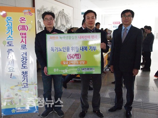 (주)좋은사람들에서는(왼쪽:김성배 대전영업소장) 대전시청 1층에서 열린 내복 할인 판매 행사를 실시하고 겨울철 독거노인들에게 전달해 달라며 내복 50벌(200만원 상당)을 대전시(가운데:이택구 환경녹지국장)에 전달했다.