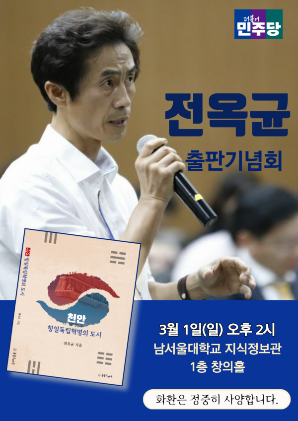 [충청뉴스 유규상 기자] 전옥균(이웃사촌무료법률상담소장) 더불어민주당 천안시장 출마예정자가 오는 3월 1일 오후 2시 남서울대학교 지식정보관 1층 창의홀에서 출판기념회를 가진다.