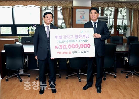 한밭대학교(총장 이원묵)는 남용현 (주)트루윈 대표이사가 5일 오전 총장실에서 세종산학융합캠퍼스 설립 기금 조성 등을 위해 대학발전기금으로 3천만원을 쾌척했다고 밝혔다.