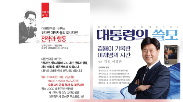 이날 DCC 제1전시장 2층 그랜드볼룸에서는 이장우 대전시장의 저서 ‘대한민국을 바꾸는 위대한 개척자들의 도시 대전, 전략과 행동’ 북콘서트가 열린다. 오전 10시 30분부터 사인회에 이어 오후 3시 공식 행사까지 예정돼 있다.