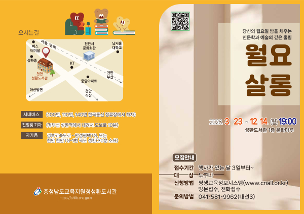 [충청뉴스 유규상 기자] 성환도서관(관장 이정숙)은 3월부터 12월 월요일 저녁 7시, 1층 문화마루에서 인문·예술 복합 기획『월요살롱』을 운영한다.