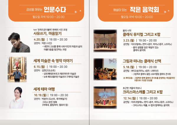 또한 ‘해설이 있는 작은 음악회’는 ▲클래식 뮤지컬 그리고 K-팝 ▲그림과 떠나는 클래식 산책 ▲ 포근한 겨울의 하모니 등 계절의 분위기를 담은 공연이 펼쳐진다.