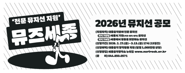 세종시문화관광재단(대표이사 박영국)은 지역 대중음악의 뿌리를 단단히 내리고 음악 생태계에 새로운 활력을 불어넣을 대중음악 창작지원사업 ‘2026 뮤즈세종’의 주인공을 찾는다.