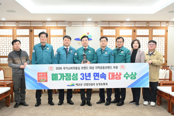 [충청뉴스 박영환 기자] 예산군은 농특산물 공동브랜드 ‘예가정성’이 3년 연속 ‘2026 국가 소비자중심 브랜드(지역공동브랜드 부문) 대상’을 수상했다고 6일 밝혔다.
