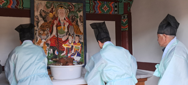 제사 당일에는 저녘에 어둠이 시작되는 해질 무렵에 제주와 축관(축문을 읽는 사람)과 한 두사람이 올라가서 제사를 올리는데 금년도에는 마을 형편을 고려하여 참여가 용이한 오후 2시 정도 마을 산신각에 올라가 제사를 지냈다.