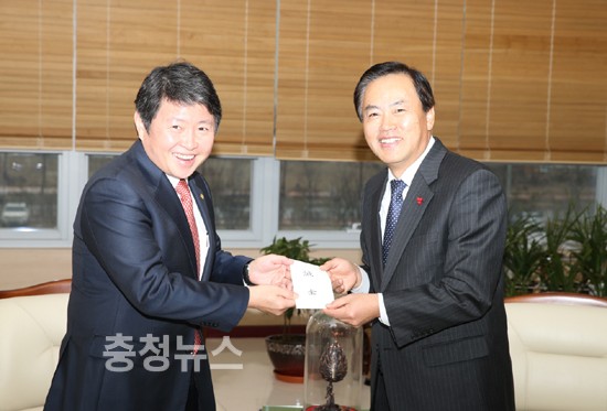 ▲ 전찬환 충남교육감 권한대행이 9일 오후 도교육청 접견실에서 김용하 대한결핵협회 대전세종충남지부 회장(사진 왼쪽)에게 결핵퇴치 사업 후원을 위한 성금 1백만원을 전달하고 있다.