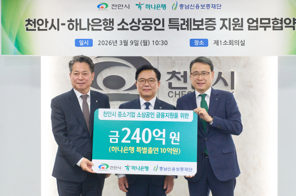 [충청뉴스 유규상 기자] 천안시가 9일 지역 소상공인 자금난 해소를 위해 민관 협력 특례보증 사업을 확대 추진하는 ‘2026 소상공인 특례보증 업무협약’을 체결했다.