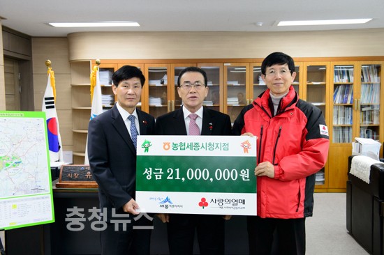 NH 농협은행 세종본부(본부장 백학현)가 11일 오전 세종특별자치시(이하 세종시, 시장 유한식) 시장 집무실을 방문, 이웃사랑 성금 2,100만원을 기탁했다.