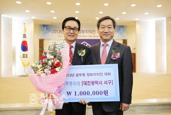 대전광역시 서구(구청장 박환용)는 안전행정부 주관으로 시행한 ‘2013 공무원 정보지식인 대회’에서 우수기관으로 선정돼 ‘국무총리상’ 수상의 영예를 안았으며, 지자체 중 1위를 차지했다.