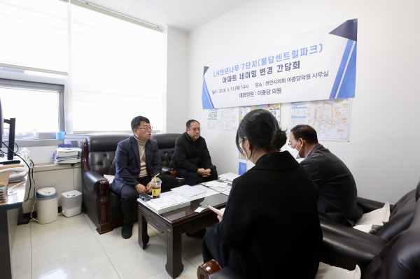 [충청뉴스 유규상 기자] 천안시 이종담시의원(무소속, 불당동)은 12일 불당동 LH천년나무 7단지 아파트 명칭 변경과 관련해 주민 의견을 청취하고 관계 부서와 의견수렴을 위해 간담회를 개최했다.
