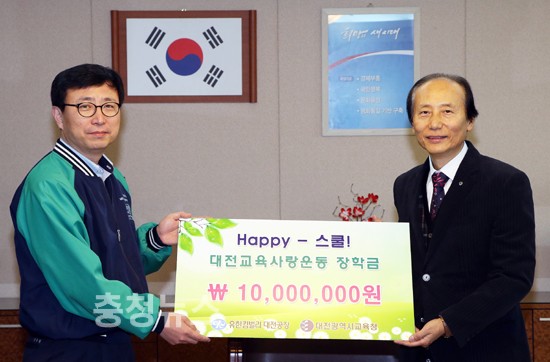대전시교육청(교육감 김신호)은 12일 오전 시교육청 교육감실에서 유한킴벌리 신봉철 대전공장장을 비롯한 임직원과 교육청 관계자 참석하에 유한킴벌리(대표 최규복)로부터 Happy 스쿨 장학금 1천만원을 기탁받았다.