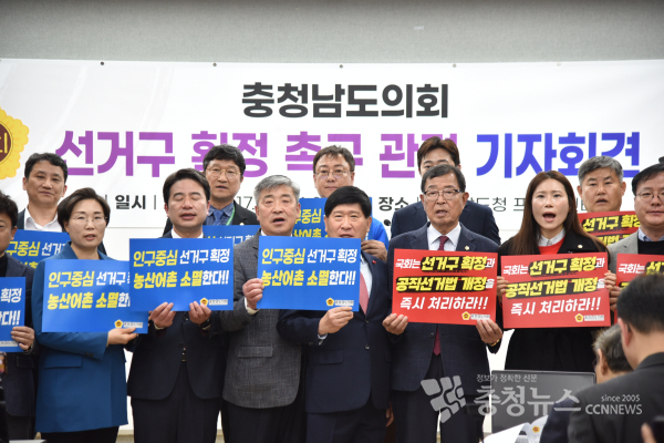홍성현 의장과 의원들은 이날 충남도청 브리핑룸에서 기자회견을 열어 "예비후보자 등록 기간이 지났음에도 국회 정치개혁특별위원회는 선거구 획정조차 정하지 못하고 있다"며 "이는 후보자와 유권자 모두에게 혼란을 초래하는 매우 심각한 상황"이라고 말했다.