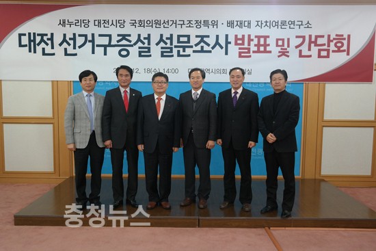 새누리당 대전광역시당 <국회의원선거구 조정 특별위원회>(위원장 곽영교)는 18일 오후 대전시의회 4층 대회의실에서 <선거구획정 방식의 개선과 대전의 선거구 증설에 관한 설문조사> 결과발표와 간담회를 가졌다.